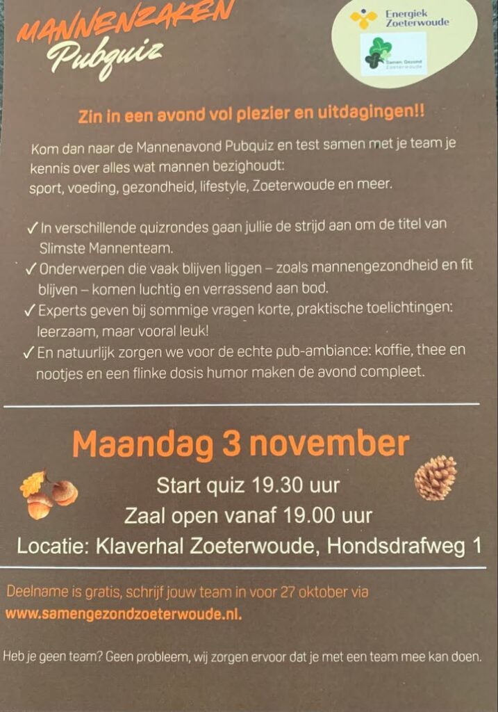Zin in een avond vol plezier en uitdagingen? Samen Gezond Zoeterwoude organiseert een avond over Mannen Zaken!